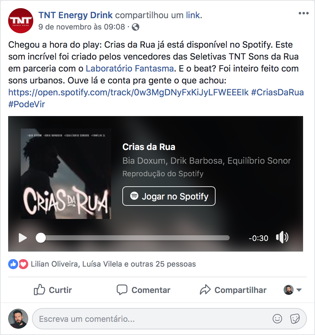 Aqui podemos ver como amarramos os canais da marca, influenciadores, as bandas, os canais do LabFantasma, o próprio Festival e o Spotify para entregar a campanha toda e a mesma mensagem. De 30 de Outubro a 16 de Novembro, tínhamos conteúdo todos os dias. Passando pelos momentos-chave: Dia do Festival (03), Lançamento da música (09), Teaser do Clipe (10), e o Dia Mundial do HipHop (12) com o Lançamento Oficial do Filme.